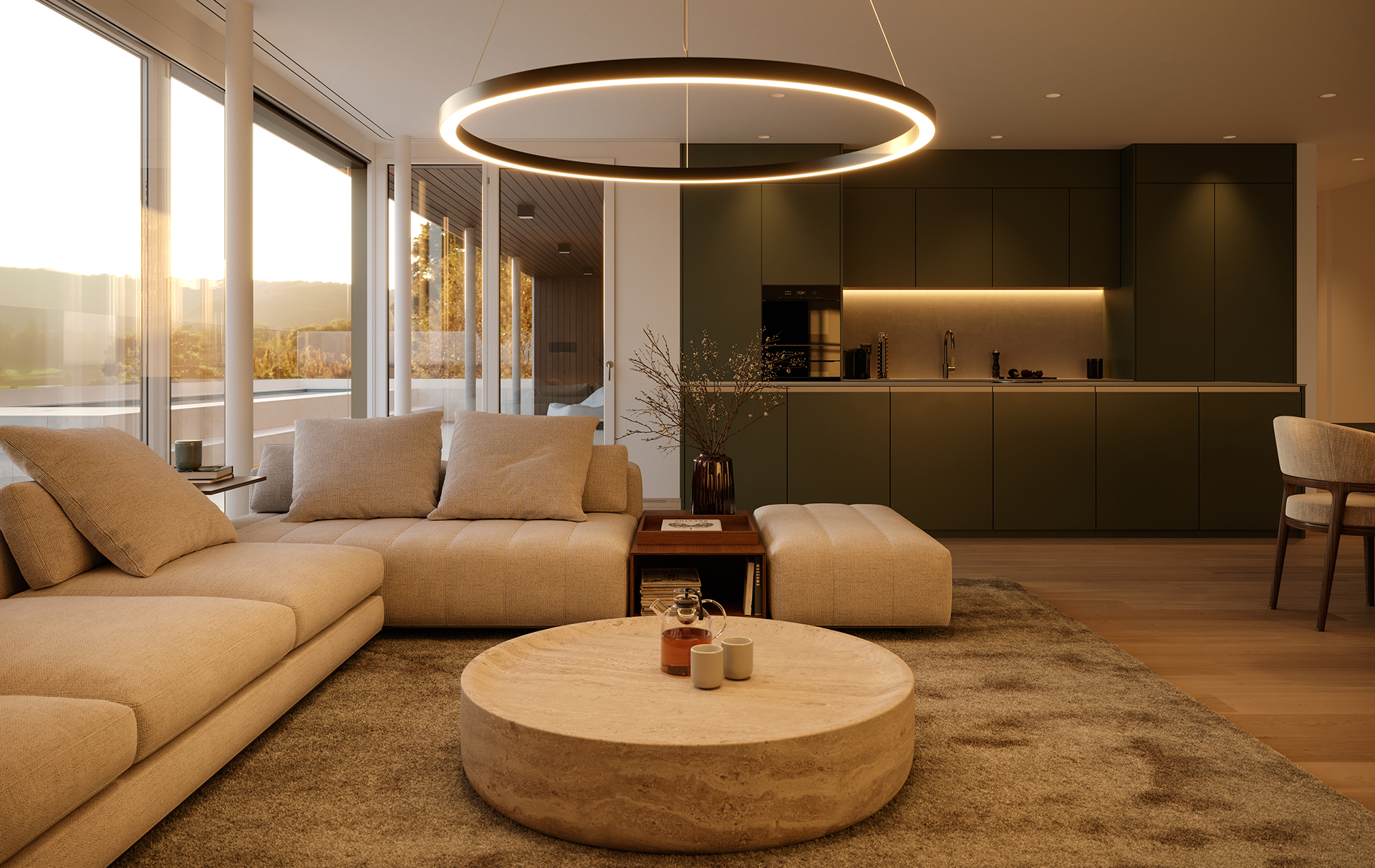 Hohe Wohnräume, einer liebevoll konzipierten und bis ins Detail abgestimmten Innenarchitektur, bestehend aus edlen Materialien und warmen Holzelementen, welche sich bis auf die Terrasse erstrecken.